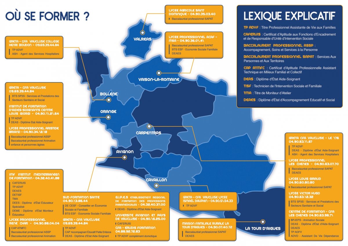 Dans le cadre du projet "Ambassadeurs du Domicile", après avoir co-construit une malette pédagogique à destination des collègiens et lycéens, une brochure a été pensée afin de leur proposer un parcours d’orientation dans les secteurs sanitaire, médico-sociale et des services à la personne, sur le territoire du Vaucluse.