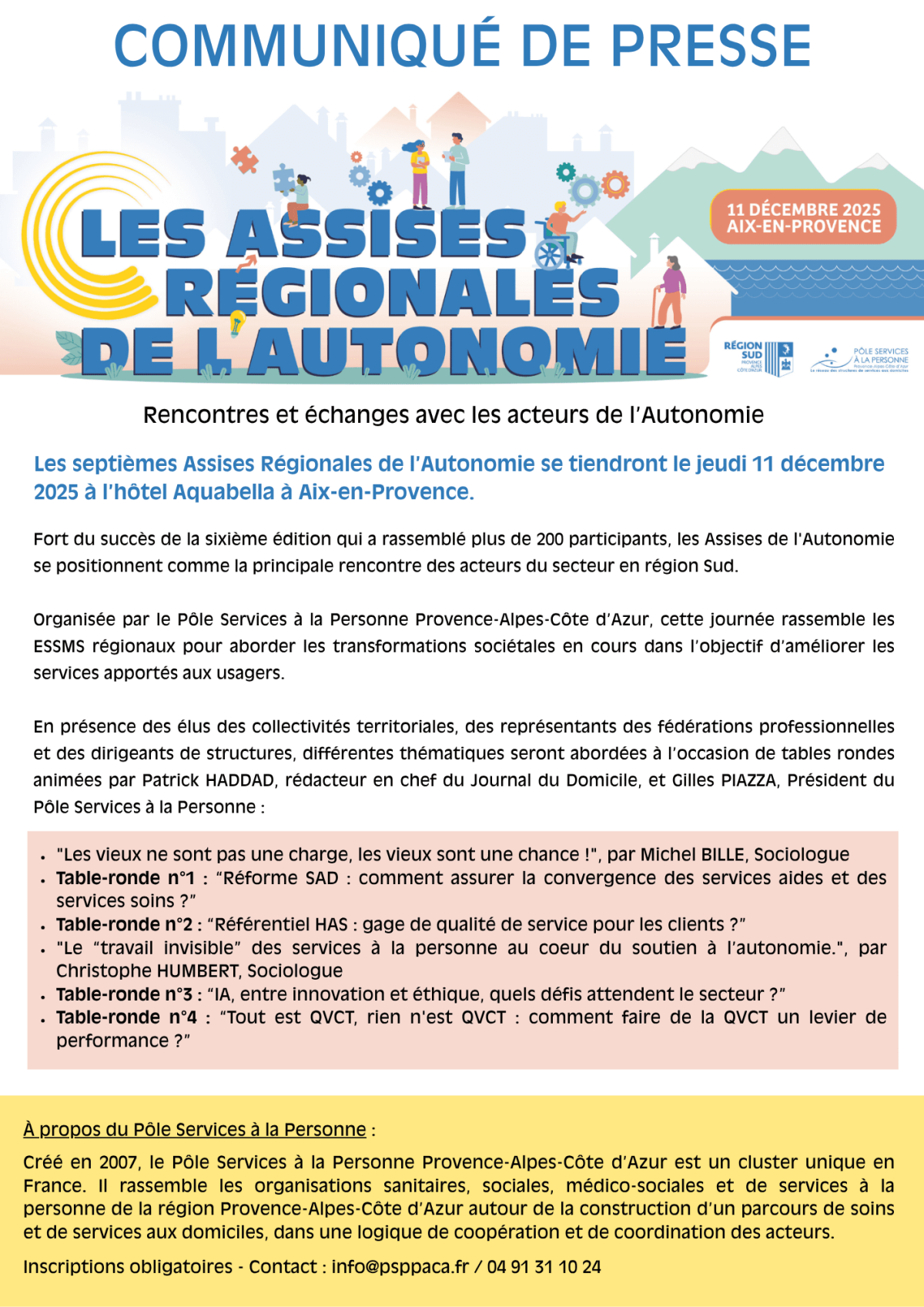 Accueil > Actualités > Communiqué de presse : Assises Régionales de l’Autonomie 2025 Communiqué de presse : Assises Régionales de l’Autonomie 2025 Publié le mardi 7 octobre 2025 Pour vous inscrire, merci de nous renvoyer le bulletin d’inscription complété avant le 28 novembre 2025 : Bulletin d’inscription Assises 2025