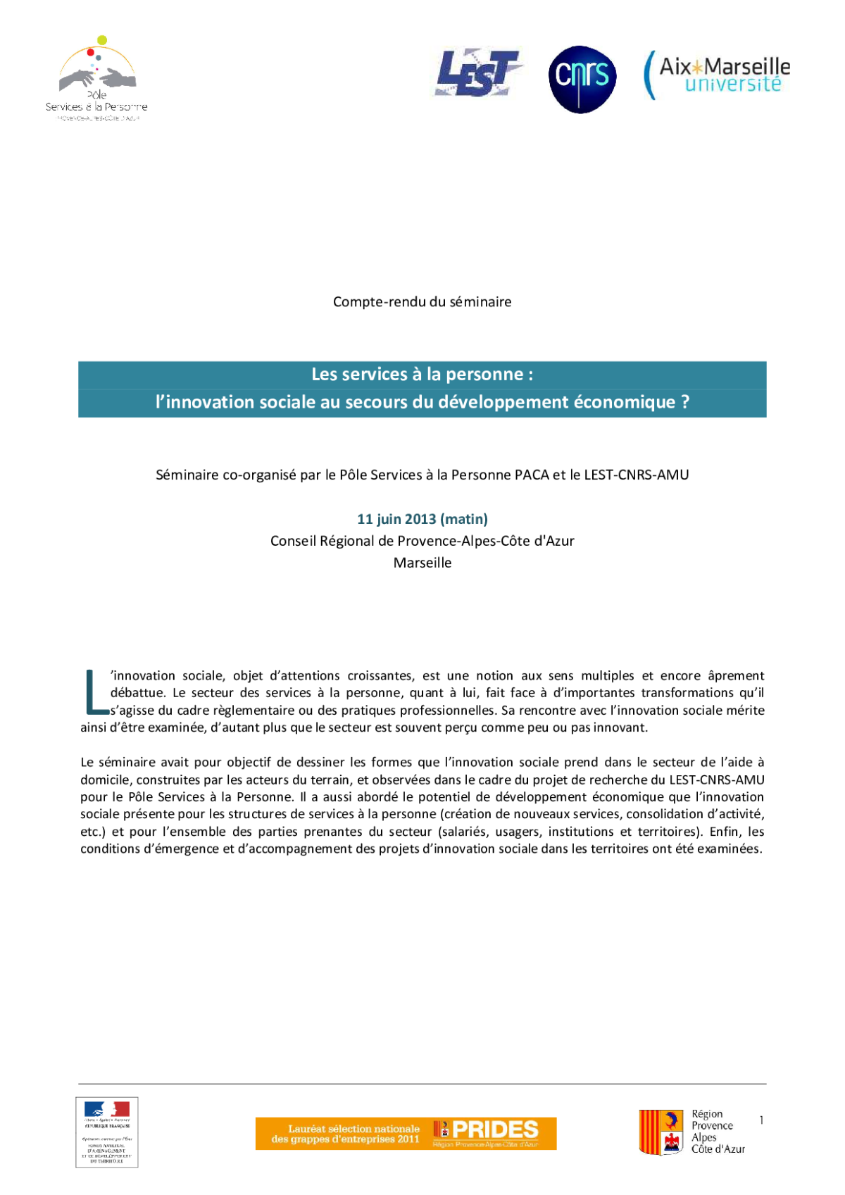 Le Pôle Services à la Personne PACA a mené en 2012 en collaboration avec LEST-CNRS, un projet de recherche sur l’innovation sociale dans les services à la personne.
